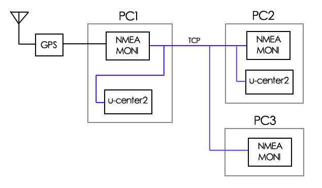 NMEA Monitor for Windows (NMEA.exe)を利用してネットワーク内の離れた複数のPCでモニタ/制御を行えます。